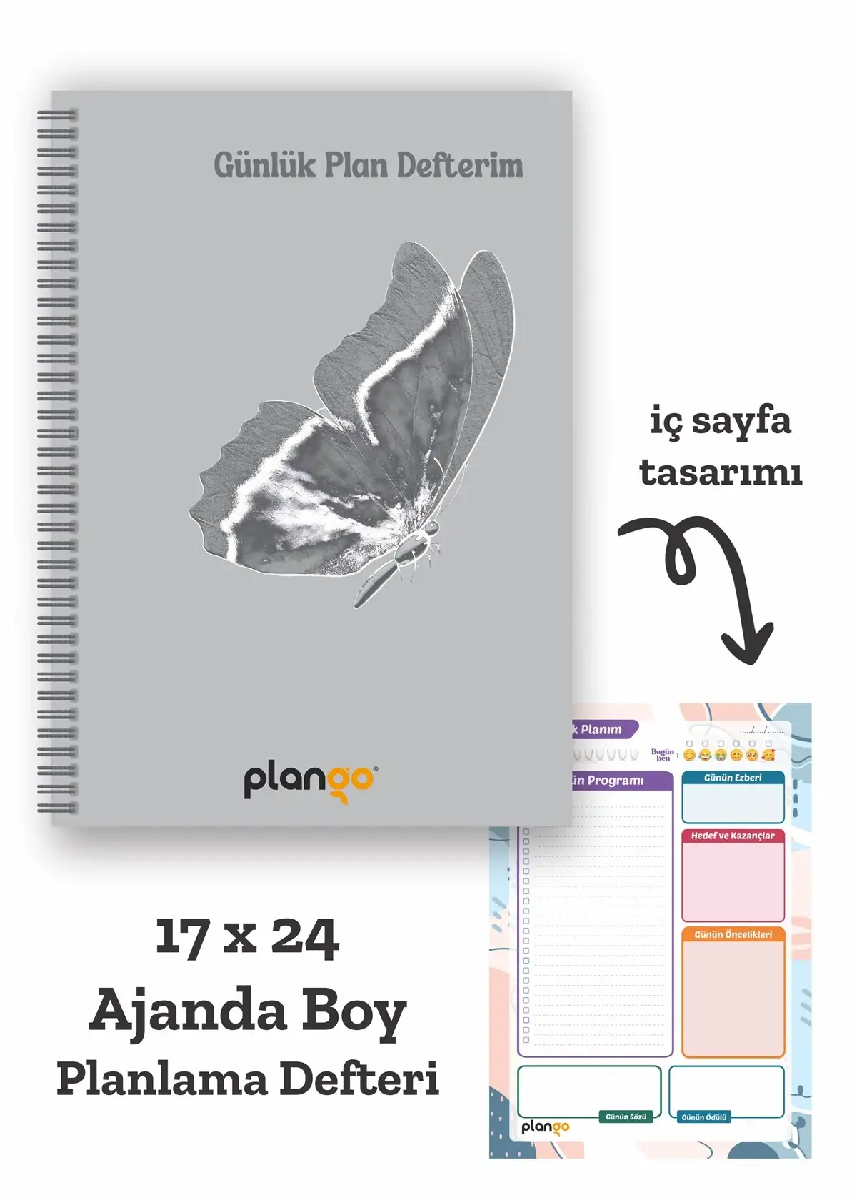Plango Gri Kelebek Günlük Planlayıcı Defter. Günlük Planlarınızı yazabileceğiniz, Gününüzü düzene sokabileceğiniz Günlük Planlama Defteri - Daily Planner Notebook gerek İş Hayatınızı Düzene Sokacak gerekse de Ders Çalışma Planlayıcısı olarak kullanılacak yapıdadır.