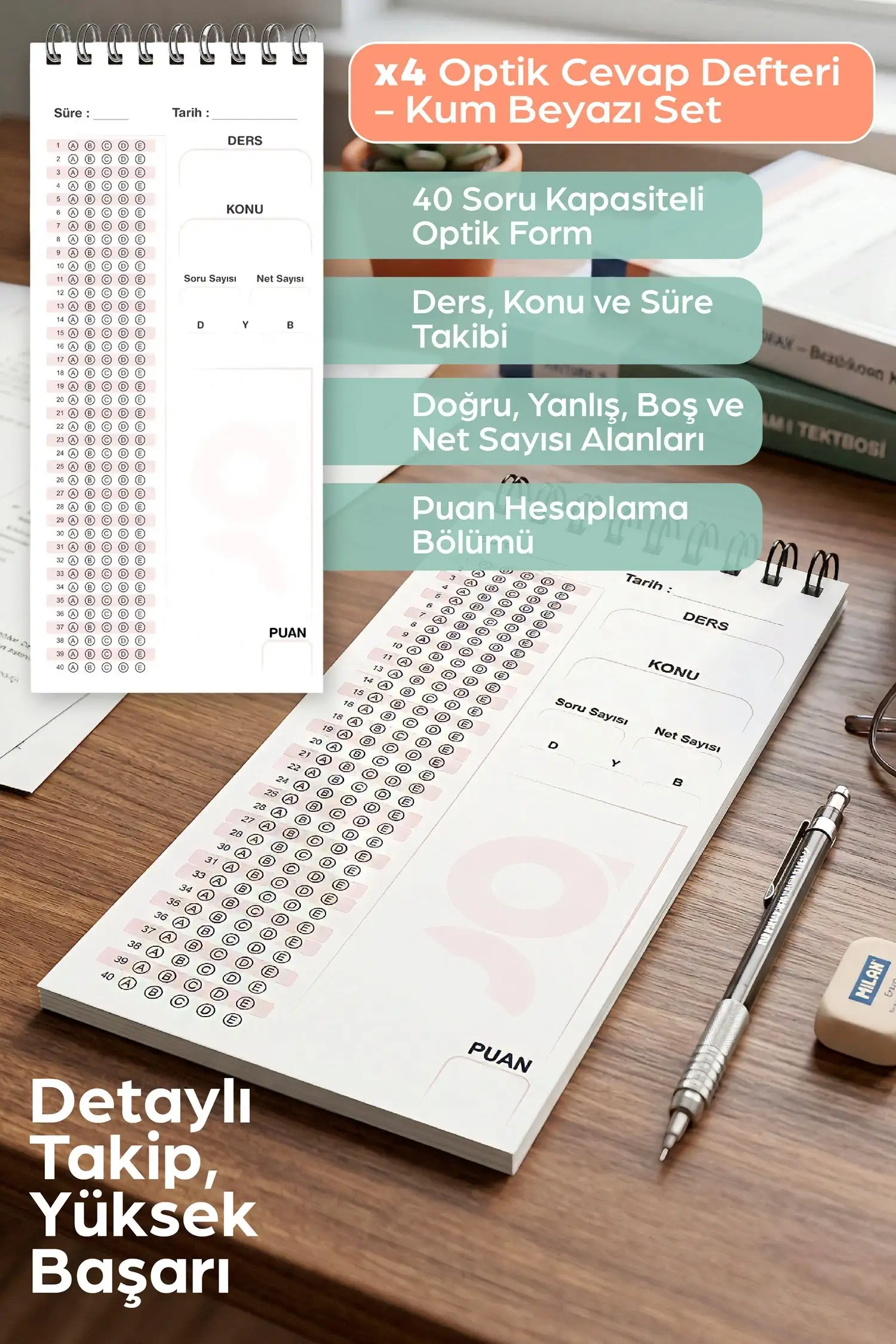 - 200 sayfalık Optik Cevap Sayfası içermektedir.