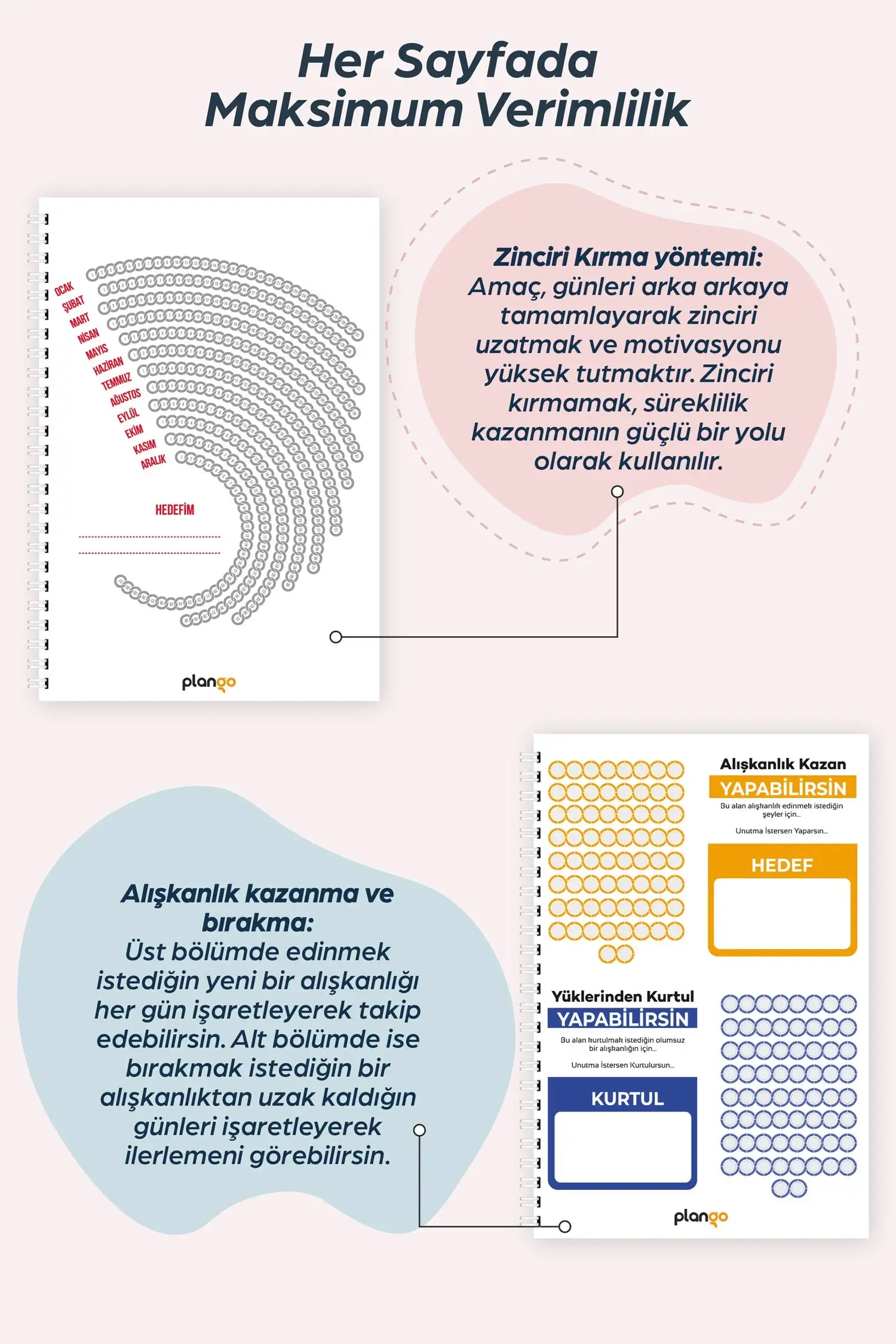 Plango Planlama Defteri günlük, haftalık ve aylık planlarında sana rehber olacak. Plango Planlama Defteri başarman için ilk adımın. Haydi sen de ilk planını vakit kaybetmeden yapmaya başla!