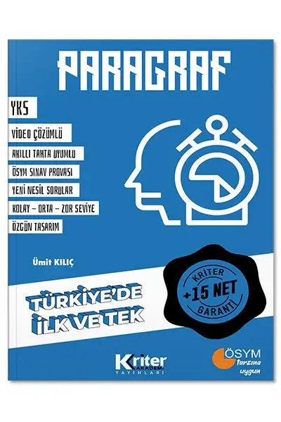 Türkçe dersinde en çok sorunun çıktığı alan paragraftır. TYT’de yaklaşık 20 ve AYT’de yaklaşık 3 soru paragraftan çıkar. İşinize yarayacak özet bilgileri, en çok çıkan soru kalıplarıyla birlikte işleyen, 15 net yapmanızı garanti eden; kolay anlaşılır, kendi kendine çözülebilen, video çözümlerin izlenebildiği eşsiz bir kaynak.